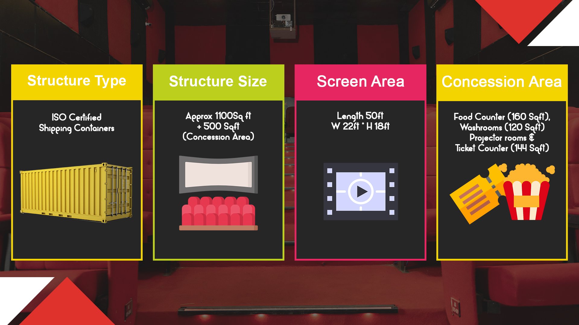 The Container Theatre is a cost effective and energy efficient solution when compared to traditional Multiplexes and has a quick construction turn-around period of 2-3 months.